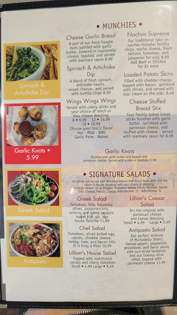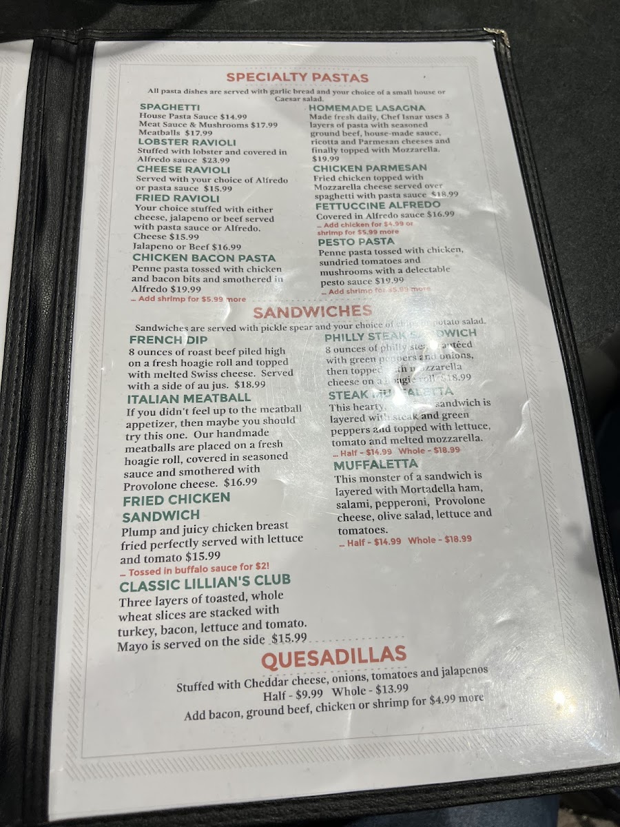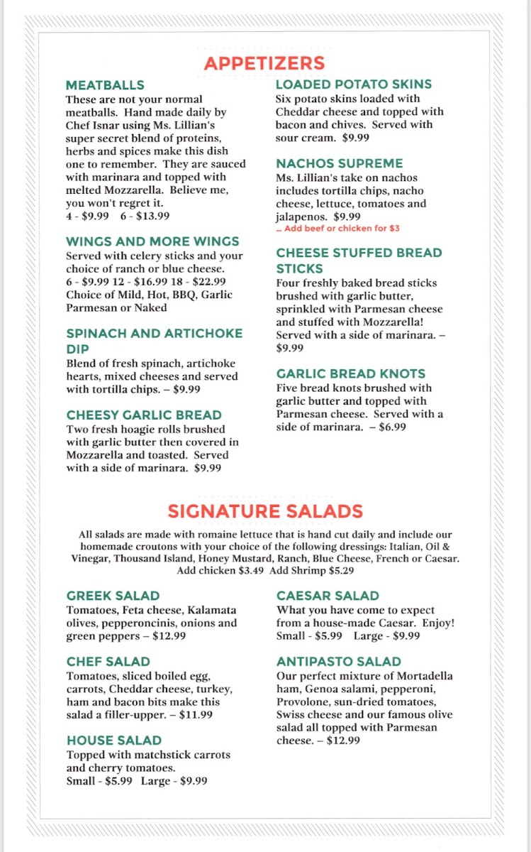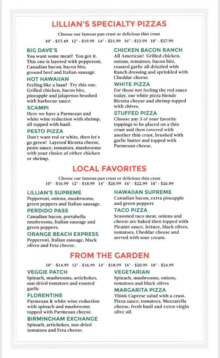 Lillian’s Pan Pizza Menu