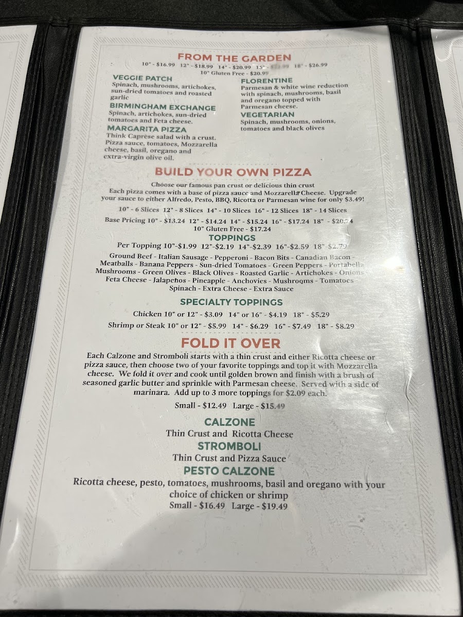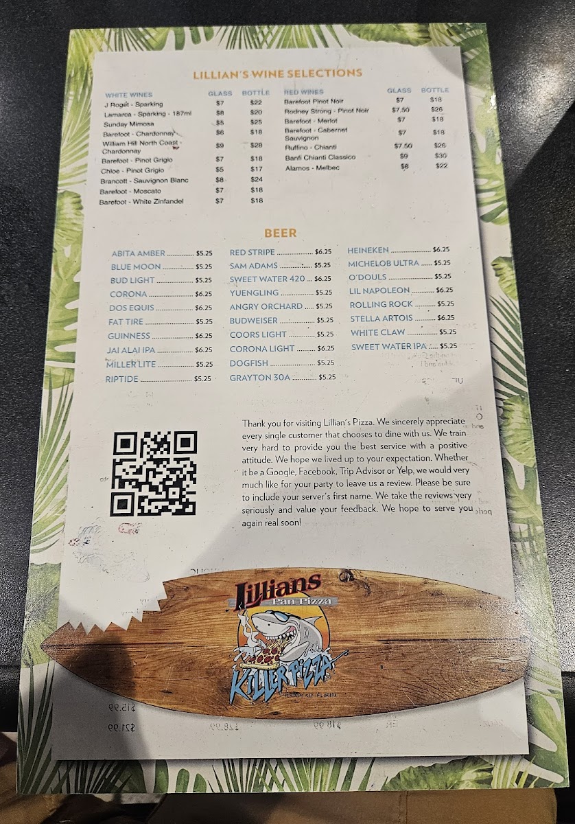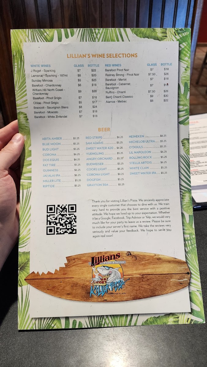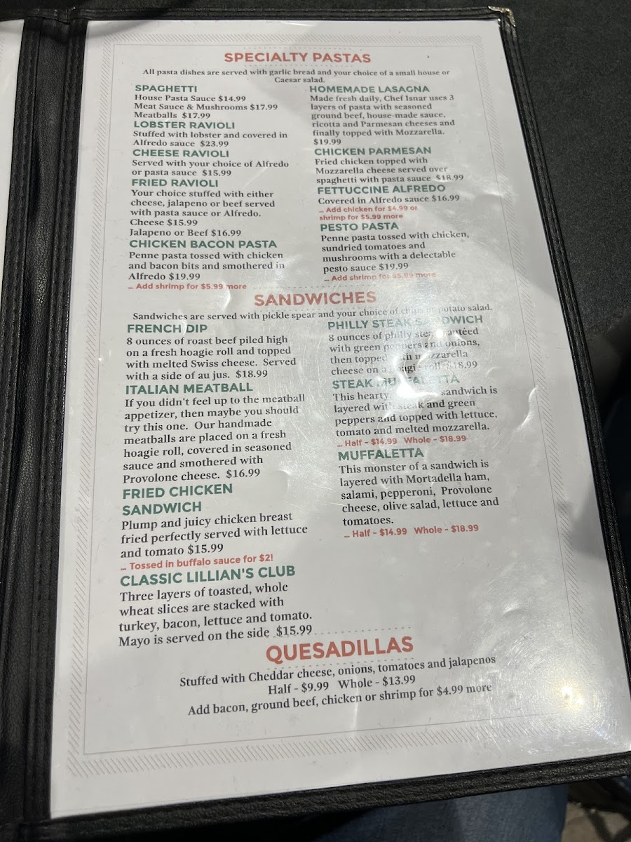 Lillian’s Pan Pizza Menu